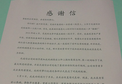 上月,光通信收到了彭芙蓉寫來的感謝信,表達(dá)了對公司捐助愛心款25000元的感激之情。現(xiàn)將來信刊登如下。